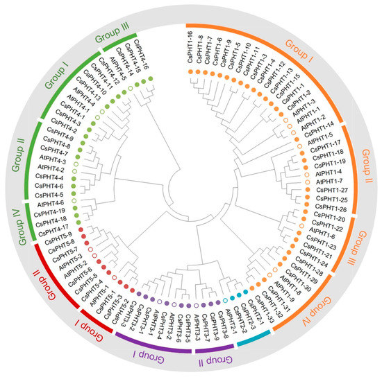 To investigate the evolutionary relationship between 73 Camelina and 22 Arabidopsis PHTs, their protein sequences were aligned to generate a phylogenetic tree using the neighbor-joining method in MEGA X [46] (Figure 1). Our results indicate that PHT1 family proteins were divided into four major groups, with AtPHT1;1/1;2/1;3 clustered in Group I along with 16 CsPHT1s. Groups II and IV each contained six CsPHT1s corresponding to their close homologous pairs, AtPHT1;4/1;7 and AtPHT1;8/1;9, respectively. While AtPHT1;5 was categorized into Group II, the Camelina genome appeared to lack homoeologs in this group. AtPHT1;6 along with five CsPHT1s were classified into Group III. The PHT2 family contained one AtPHT2;1 and three CsPHT2 members. Two distinct groups were found for the CsPHT3 family, with AtPHT3;1/3;2 and six CsPHT3 members in Group I, and AtPHT3;3 and three CsPHT3s in Group II. CsPHT4 family proteins formed four separate groups, with seven CsPHT4s corresponding to AtPHT4;1/4;4 homologous pairs in Group I, six CsPHT4s with AtPHT4;2/4;3 in Group II, and three CsPHT4s with AtPHT4;5 and AtPHT4;6 in Group III and IV, respectively. CsPHT5 family consisted of two distinct groups, AtPHT5;1 along with three CsPHT5s in Group I, and AtPHT5;2/5;3 with six CsPHT5s in Group II.