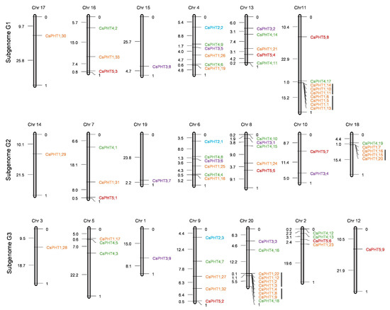 CsPHT genes were mapped to Camelina chromosomes based on their genomic locations using the MapDraw program [47]. Subgenome G1 and G3 each contained 25 CsPHT genes, and subgenome G2 harbored 23 CsPHT genes (Figure 2). This difference resulted from fewer CsPHT1 genes in subgenome G2 as compared to subgenomes G1 and G3. Among the twenty chromosomes, CsPHT1 genes were largely clustered on chromosomes 11, 18 and 20. CsPHT2 and CsPHT5 family genes were equally distributed across the three subgenomes. CsPHT3 family genes were dispersed unevenly among the three subgenomes, with four CsPHT3s in subgenome G2, three in subgenome G1, and two in subgenome G3. While CsPHT4 family genes were equally distributed between subgenome G1 and G2 with six genes each, one additional gene was found in subgenome G3.