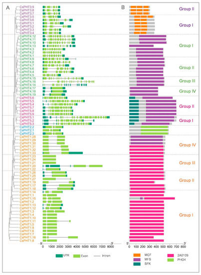 To find conserved domains within CsPHT family proteins, we scanned their protein sequences in NCBI’s Conserved Domain Database [50]. In general, some domains were specifically conserved within the same CsPHT family, while others were conserved across multiple CsPHT family proteins (Figure 3B). For instance, CsPHT1/4/5 family proteins all possessed conserved MFS (Major Facilitator Superfamily) or 2A0109 domains, which were found in Major Facilitator Superfamily proteins that transport Pi and other ions/substrates across plasma membrane and internal compartments including plastids, Golgi and vacuoles in Arabidopsis [16,19,21,22,23,51,52]. On the other hand, the PHO4 (PHOSPHATE4) domain was specifically conserved in CsPHT2 family proteins, similar to their Arabidopsis ortholog, AtPHT2;1, that transports Pi into chloroplasts [11,12]. CsPHT5 family proteins contained highly conserved SPX (SYG1/PHO81/XPR1)-MFS domains, which were specifically found on vacuolar Pi transporters in Arabidopsis and rice to maintain Pi homeostasis [22,23,52,53,54]. MCF (Mitochondrial Carrier Family) domains were uniquely conserved in CsPHT3 family proteins, implying their roles as Pi transporters in mitochondria [13,14,55]. However, Group I of the CsPHT3 family contained two MCF domains, while three were found in Group II, suggesting a possible functional divergence between these two groups in mitochondria.