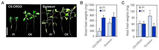 (A) Phenotype, (B) shoot biomass, and (C) root biomass of the low-P-sensitive CS-CROO and the low-P-tolerant Suneson grown under low-P (-Pi, 10 µM) and the control (CK, 312 µM) conditions for four weeks. White scale bar represents 5 cm. The biomass data represents the mean ± SD of one of the three experiments (n = 10). Asterisk indicates a significant difference (* p < 0.0005) between -Pi and CK conditions.