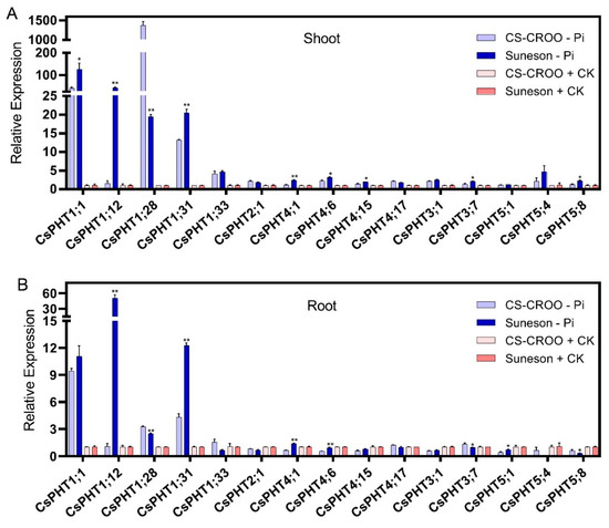 Expression analysis of 15 selected CsPHT genes in (A) Shoot and (B) Root of the low-P-sensitive CS-CROO and the low-P-tolerant Suneson treated under low-P (-Pi, 10 µM) and the control (CK, 312 µM) conditions for four weeks, as revealed by qRT-PCR. The mean ± SD of three biological replicates are presented. Asterisks indicate a significant difference (* p < 0.01 and ** p < 0.001) in gene expression between two Camelina accessions after Pi treatments.