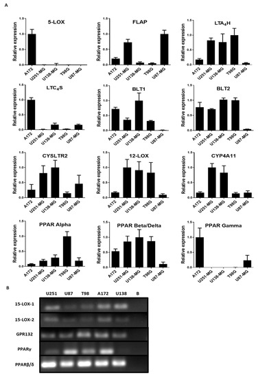 Profile of the lipoxygenase pathway metabolism in 5 glioblastoma (GBM) cell lines. (A) qRT-PCR of the enzymes and receptors involved in lipoxygenase and cytochrome P450 (CYP450) pathways in a GBM cell line. Histograms show the relative expression of the genes for: 5-LOX, FLAP, LTA4 hydrolase (LTA4H), LTC4 synthase (LTC4S), BLT1, BLT2, CYSLTR2, 12-LOX, CYP4A11, peroxisome-proliferator-activated receptor (PPAR) alpha, PPAR beta/delta, and PPAR gamma. Values represent the genetic expression relative to the endogenous 18S and the standard deviations calculated by ΔΔCT. N = 3, in duplicate. (B) PAGE of conventional RT-PCR of the 15-LOX pathway in five GBM cell lines. Cell lines U251-MG, U87-MG, T98G, A172, and U138-MG were used to identify the genes associated with the 15-LOX pathway. All the genes were amplified in all cell lines, except PPARγ (gamma) in U138-MG. Blank (B).