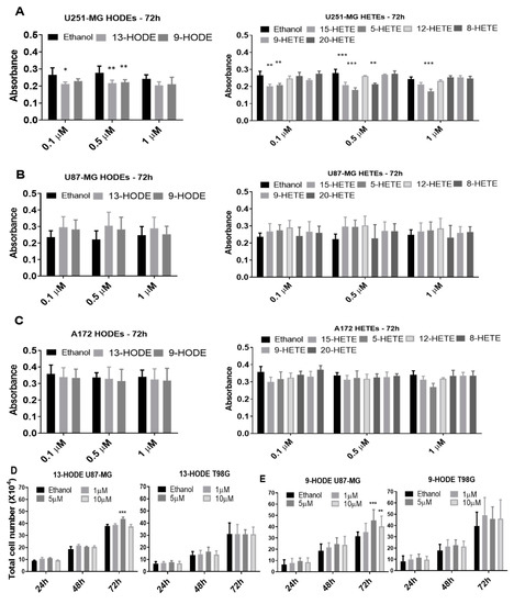 Cell viability of cells treated exogenously with lipids as measured by 3-(4,5-dimethylthiazol-2-yl)-2,5-diphenyltetrazolium bromide (MTT) conversion (A–C). Histograms show MTT absorbance after 72 h of treatment with a HODE and HETE panel for U251-MG (A), U87-MG (B), and A172 (C). Significance was found only in some treatments of U251-MG (A). Exogenous 13-HODE and 9-HODE treatments on U87-MG and T98G (D,E). U87MG treated with 13-HODE demonstrated a significant increase in cell count with the 5 µM treatment at 72 h, while no effect was seen on T98G (D). U87MG treated with 9-HODE demonstrated a significant increase in cell count with 5 µM and 10 µM treatments at 72 h, while no effect was seen on T98G (E). p < 0.05 (*), p < 0.01 (**), and p < 0.001 (***). N = 3, in duplicate.