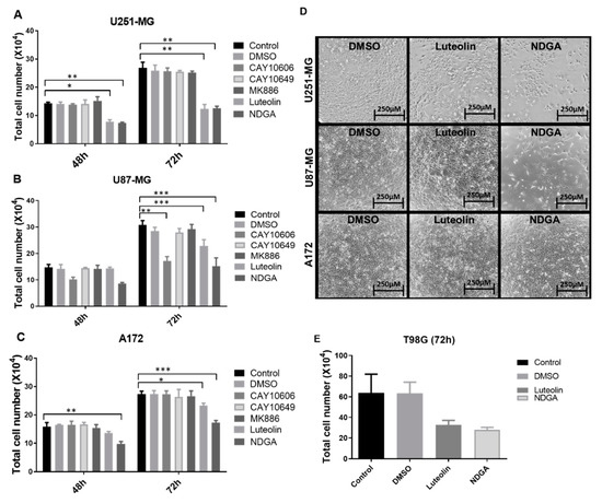Treatment with the inhibitors luteolin, NDGA, CAY10606, CAY10649, MK886, CAY10678, and CAY10526 in U87-MG (A), U251-MG (B), and A172 (C). Graphs show the results after 48 h and 72 h, with the data analysis performed in relation to the control; cell numbers decrease after NDGA and luteolin. Phase-contrast microscope images show cell plates at 72 h right before collection (D). Luteolin and NDGA treatment at 72 h with T98G (E). * p < 0.05, ** p < 0.01, and *** p < 0.001. N = 3, in duplicate, except for (E), which is N = 2 in duplicate. DMSO: dimethyl sulfoxide.