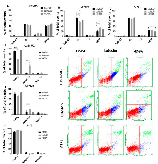 Flow cytometer analysis of the cell cycle and apoptosis. Cells were treated with luteolin and NDGA for 72 h before propidium iodate incorporation. Histograms show the percentage of U251-MG (A), U87-MG (B), and A172 (C) cells in each cell cycle phase. Both luteolin and NDGA reduced G1 and increased G2/M in the U87-MG population. Luteolin did not influence the U251-MG or A172 cell cycles. Apoptosis analysis by flow cytometer. (C) cells were treated with luteolin and NDGA for 72 h before propidium iodate and annexin V incorporation. Histograms show the percentage of apoptotic cells in U251-MG (D), U87-MG (E), and A172 (F), with an increase in apoptotic cells both in U251-MG and U87-MG. Dot plot graphs (G) show population distribution among healthy (red), apoptotic (blue), and necrotic (green) cells. * p < 0.05, ** p < 0.01, and *** p < 0.001. N = 2, in duplicate.