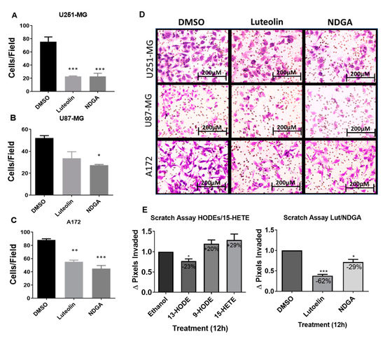 Considering the previous results related to cell growth/cycle and using the previously chosen concentrations, Transwell assays to evaluate the influence of luteolin and NDGA treatments upon the in vitro migration of U251-MG, U87-MG, and A172 cells were performed. Cells migrated for 24 h while submitted to their respective treatments before staining and quantification. The results showed that both luteolin and NDGA reduced cell migration through the Transwell membrane. U251-MG migration was significantly reduced by 69% and 67% using Luteolin and NDGA, respectively, when compared with their dimethyl sulfoxide (DMSO) controls (Figure 6A). Similarly, U87-MG migration was reduced by 47% with NDGA, while luteolin’s 35% reduction was not statistically significant (Figure 6B). A172 migration was reduced by 37% and 49% using luteolin and NDGA, respectively; both were statistically significant (Figure 6C). The photomicrograph of Transwell membranes show representative images for each treatment and the DMSO control (Figure 6D). Additionally, a wound-healing assay conducted with T98G cells showed a reduction in cell migration with only 12 h of luteolin or NDGA treatments (Figure 6E and Supplementary Figure S8). The migration of cells treated with 9-HODE and 15-HETE was not affected. However, 13-HODE did reduce T98G migration.