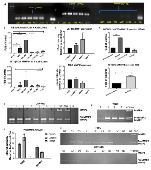 RT-PCR/zymography basal metalloprotease (MMP) expression in GBM cell lines. (A) RT-PCR gel electrophoresis of MMP-2, -9, and -14 in 5 GBM cell lines. MMP9 was poorly expressed. (B) qRT-PCR of the relative MMP expression in 5 GBM cell lines compared to MCF7. (C) Zymographies of baseline MMP expression in U87-MG (top) and T98G (bottom) cells were obtained by cultivation in T-25 plates with 2 mL of serum-free Dulbecco’s modified Eagle’s medium (DMEM) for 21 h. Relative intensities were adjusted by the number of cells counted in each plate when the medium was collected and compared with the HT1080 relative expression. (D) qRT-PCR expression of MMP2 mRNA after 72 h of treatments with HODEs and 15-HETE in U87-MG (top) and T98G (bottom). (E) Gelatin zymography of U87-MG samples cultivated in either 2 mL (Lane 1A) or 4 mL (Lane 1B) of the medium were run in duplicates. Each lane was a separately cultivated trial. Each band shows the relative activity of proMMP2 (72 kD), activated MMP2 (MMP2: 62 kD), and proMMP9 (92–82 kD) compared with the HT1080 fibrosarcoma cell line. (F) Zymography of the T98G cell medium. (G) Zymography values of proMMP2 expression after 72 h of treatment with 15-LOX inhibitors. (H) Zymography gels of T98G (top) and U87-MG (bottom). D1, D2 and D3 = (DMSO N = 1, 2 and 3). L1, L2 and L3 (luteolin N = 1, 2 and 3). N1, N2 and N3 (NDGA N = 1, 2 and 3). B = blank. All experiments with N = 3.