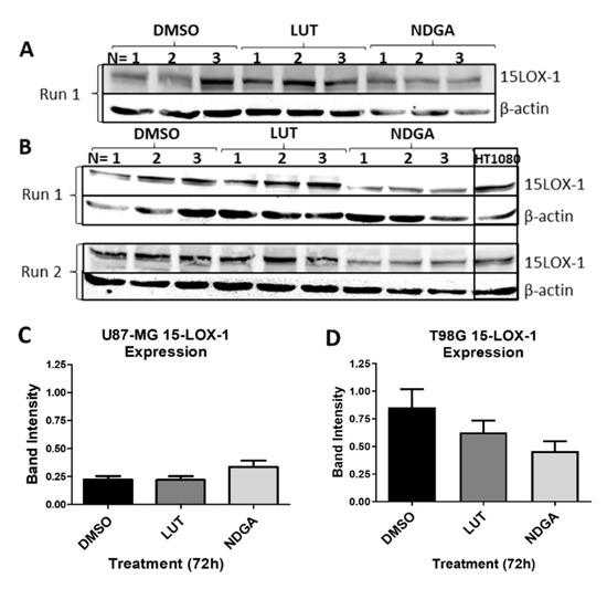To address whether the results of the functional assays herein described are due to the inhibition of 15-LOX activity or due to the reduced synthesis of 15-LOX, a Western blot was performed (Figure 8). Samples of the protein lysates of cell lines U87-MG (Figure 8A) and T98G (Figure 8B) treated with luteolin or NDGA for 72 h were tested. No significant reduction in band intensity when normalized to the sample control (β-actin) was identified in either cell line (Figure 8C,D). The LOX inhibitors (luteolin and NDGA) inhibited 15-LOX-1 activity and not its synthesis.