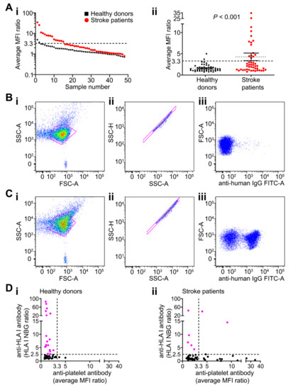 Characterisation of anti-platelet antibodies in patients and controls. (A) Anti-platelet antibody levels detected in healthy blood donors and stroke patients are shown in order of decreasing levels of the MFI ratio for individual samples (log scale; (Ai)) or in a scatterplot with mean ± SEM of the average MFI ratio (linear scale; (Aii)). Data points are mean of three replicates; n = 48 of stroke patient and 50 healthy blood donors. p-values are shown (Mann–Whitney U test). Dashed lines represent mean + 2 SD of controls (y = 3.3). MFI ratio was calculated as MFI of test subject divided by MFI of negative control. (B,C) Representative dot plot examples of anti-platelet antibodies in sera from anti-platelet antibody negative and positive patients respectively. (Bi,Ci) Dot plots of FSC-A versus SSC-A of all events with platelets gated. (Bii,Cii) Dot plots of SSC-A versus SSC-H excluding doublets within a single cell gate. Examples of negative (Biii) and positive (Ciii) detection of anti-platelet antibodies in stroke sera generated by a secondary anti-human IgG antibody conjugated to FITC. (D) Relationship between anti-platelet antibodies and anti-HLA class I antibodies in healthy blood donors (Di) and stroke patients (Dii). Dashed lines represent positivity thresholds. The threshold for anti-HLA I antibodies was set as the normalised background ratio (NBG) greater than 2.5 on any of the 12 possible HLA I beads (Luminex). The threshold for anti-platelet antibodies was set based on the mean + 2 SD of healthy blood donors (x = 3.3, as shown in A). Data points are mean of three replicates. Pink dots indicate positive samples; n = 48 of each group. Abbreviations: FITC, fluorescein isothiocyanate; FSC-A, forward scatter area; IgG, immunoglobulin G; HLA, human leukocyte antigen; MFI, mean fluorescence intensity; NBG, normalised background ratio; SSC-A, side scatter area; SSC-H, side scatter height.
