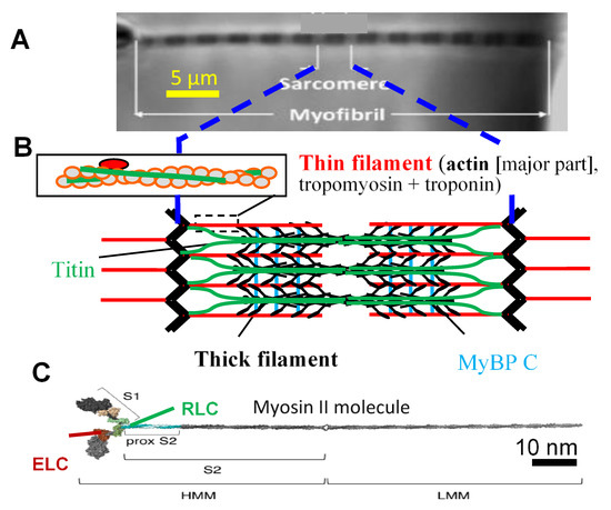 Hierarchical organization of muscle. (A) Isolated myofibril mounted for force measurements [20]. Myofibrils, with repeating structures, sarcomeres, fill the muscle cells in a highly ordered arrangement; (B) Schematic illustration of sarcomere (longitudinal view), with key protein components, i.e., thin filaments with actin and regulatory proteins and thick filaments with myosin heads (cross-bridges, black) extending from myosin backbone and accessory proteins, i.e., titin and myosin binding protein C (MyBPC); (C) Isolated full-length myosin molecule with two motor domains (left, S1, heads). Essential (ELC) and regulatory (RLC) light chains are attached to the lever arm of each of these domains. Panel C modified from [21] under license CC BY 4.0.
