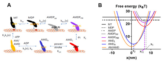 Observable contractile properties were derived in the simulations from the populations of different cross-bridge states and their elastic properties, strain, etc. [33]. For example, force is given by the sum of the total number of attached cross-bridges multiplied by the stiffness and strain of each of these cross-bridges. The strain is given by the quantity x-xi., where xi is the x-value for which the free energy of the given state has its minimum value (cf. Figure 3B showing x1, x11 and x2) and x is the coordinate describing the distance between a given point on the thick myosin filament and the nearest actin binding site. Here, this coordinate system is defined such that x = 0 nm, when the free energy in the AM state (Figure 3A) attains its minimum. In terms of the model, the free energy increases for x > xi and x < xi as a result of elastic energy added to chemical free energy of the specific state. In the case of linear cross-bridge elasticity with stiffness ks, the elastic contribution, GE, to the free energy, is given by GE = ks(x-xi)2/2, i.e., the free energy diagrams vs. x have a parabolic shape (Figure 3B). In the simulations, the population of different states for each given x-value are either derived as average values by steady-state solutions of differential equations in state probabilities (cf. [32] and code in [29]) or as the absolute number of myosin heads in different states (associated with a specific strain) for each given point in time by the use of Monte Carlo simulations [31,32]. In the latter simulations, the waiting times between interstate transitions for each strain value (x) is calculated from the value of the rate functions (Figure 3A and Table S3) using the Gillespie algorithm [41], starting with all myosin heads in the MDP state at the onset of the simulation (see further [31,32]). Specifically, here, average half sarcomere properties are simulated by assuming that 556 myosin-binding sites on actin are available for binding of myosin heads. This number corresponds to the total number of myosin binding sites along a 20 µm long filament on the assumption of 36 nm distance between neighboring sites, i.e., 20,000 nm/36 nm ≈ 556. This approach relies on assumptions that are intimately related to the idea that muscle function can be predicted from single actomyosin properties, as follows: (1) The muscle half-sarcomere contractile properties can be approximated by the contractile properties of approximately 20 actin filaments interacting with 10 thick myosin filaments. (2) This situation can be mimicked by surface adsorbed myosin motors interacting with a sufficiently long single actin filament (here taken as 20 µm) in an in vitro motility assay configuration (with added possibility to vary load on the filaments or velocity) with saturating surface density of 5000 active myosin motors per µm2.