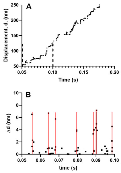 Simulated myosin propelled actin filament sliding produced by 18 myosin molecules against zero load. This number of molecules is similar to that used in the experiments of Kaya and Higuchi (2017) [37]. (A) Displacement record, time interval between vertical dashed lines considered in greater detail in (B); (B) Step changes in displacement, ∆d from region within dashed lines in A. Each point represents a step change in displacement. Note that substantial fractions of the steps are clustered in seven different 0.4 ms time intervals (covered by transparent red lines) with 2–4 steps, of amplitudes from ~1 nm to ~7 nm in each cluster.