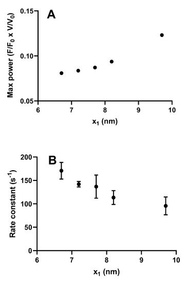 Maximum power and rate of increase in force during an isometric contraction simulated for different values of the parameter x1 in the model described in Figure 3 (similar to that in [32]). (A) Maximum power derived by steady-state solutions of differential equations in state probabilities. Statistically significant (p = 0.0167) correlation (Spearman’s r = 1) between x1 and maximum power; (B) Rate of increase in force starting from all myosin heads in the AMDPPP state estimated from fits to 4 Monte Carlo simulations at each x1 value. In each of these cases, the parameter x11 was changed in parallel with x1 with x11 = x1 −0.5 nm. Data are given as mean ± standard error of the mean. Statistically significant (p = 0.0010) correlation (Spearman´s r = −0.68) between x1 and rate constant.