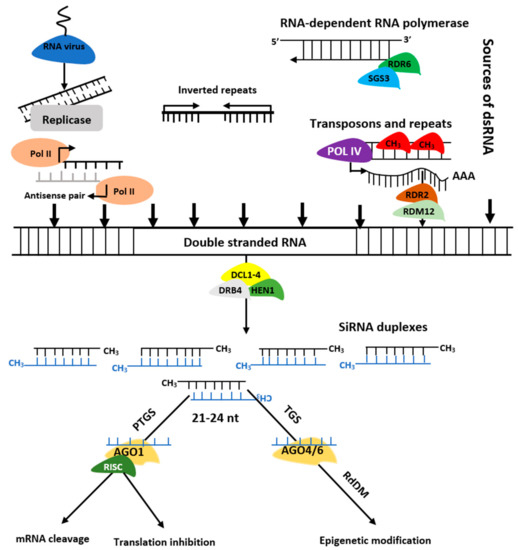 The siRNAs are grouped into trans-acting siRNAs (tasiRNA), heterochromatic siRNAs (hc-siRNA), and natural antisense siRNAs (nat-siRNAs) depending on the mode of action as well as biogenesis. tasiRNAs have a regulatory mechanism similar to miRNAs, and they act in cis and operate at loci independent from their biogenesis site. At the same time, hc-siRNA works effectively in cis within their source or homologous regions as their origins align with their targets [29]. However, nat-siRNAs are categorized into cis-nat-siRNAs and trans-nat-siRNAs. The generation of the former involves transcription of two RNAs from opposite strands of the same loci. Simultaneously, the latter involves RNA transcripts hailing from multiple loci [30]. The siRNAs biogenesis involves dsRNAs, DCL enzymes activities, and RISC containing AGO protein that controls target regulation at post-transcription or transcriptional level [31] (Figure 3). Biogenesis of ta-siRNA is dependent on SUPPRESSOR OF GENE SILENCING3 (SGS3), RNA-dependent RNA polymerases 6 (RDR6), and DCL4 [32,33] while that of nat-siRNAs depends on SGS3, RDR6, DCL1, DCL2, and a plant-specific RNA polymerase, NRPD1A [34]. Similarly, hc-siRNAs are generated by Pol IV, DCL3, RDR2, 5S rRNA genes, and NRPD1A [35,36].