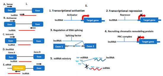 Long non-coding RNAs are transcripts that exceed more than 200 base pair (bp) in length and cannot be translated into protein [37]. They are classified into cis-natural antisense (cis-NATs), trans-natural antisense transcripts (trans-NATs), and pseudogenes [38], sense or antisense (strand of origin) [39], divergent, or convergent (orientation of transcription), and as intronic or intergenic (location) [40] (Figure 4). They are transcribed by RNA pol II, III, IV, and V and control target regulation via multiple ways, including chromatin remodeling, transcriptional repression, mimicry, RNA splicing and transcriptional enhancer (Figure 4).