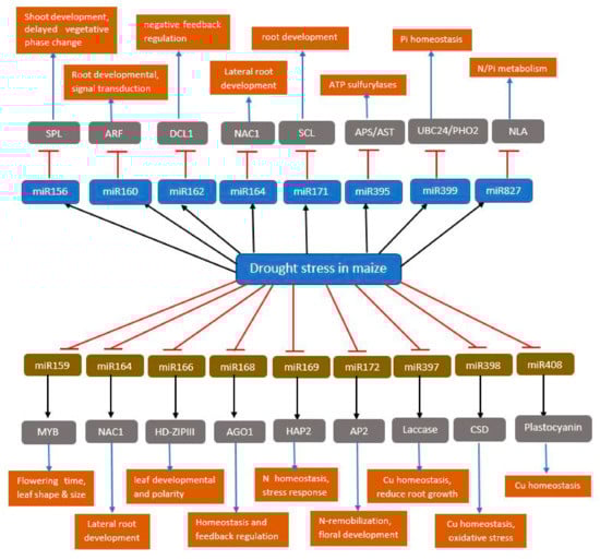 The expression of miRNAs is enhanced or suppressed in response to distinct abiotic stress. MiR393, miR397b, and miR402 were up-regulated in Arabidopsis, while miR319c and miR389a were down-regulated under dehydration stress [15]. Similarly, under drought stress in rice at the seedling stage, 17 and 16 miRNAs were suppressed and enhanced, respectively [85]. In maize under drought stress conditions, 8 and 13 miRNAs were up-regulated and down-regulated respectively in the leaves while 7 miRNAs were up-regulated and another 7 down-regulated in the roots [86]. Drought stress, on the other hand, increased the expression of miR156, miR160, miR162, miR164, and miR171, leading to a decrease in the expression of their target genes (Figure 5). miR160 target auxin response factors (ARFs) genes. ARF16 is reportedly involved in the development of root cap cells, while ARF17 acts as a nearly auxin-response gene regulator. Down-regulation of ARF16 and ARF17 will repress plant growth and thereby increase the resistance of maize to drought stress. Likewise, down-regulation of miR169 (Figure 5) led to the accumulation of nuclear factor Y (NFY), which regulates the expression of nitrate transporters, AtNRT2.1 and AtNRT1.1 [87].