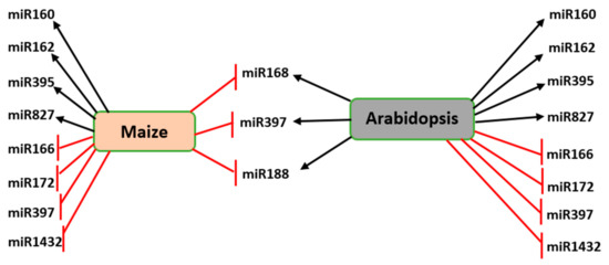 Differential expression of commonly expressed miRNAs in maize and Arabidopsis during the drought stress response. Expression of miR168, miR397, and miR188 is down-regulated in maize but up-regulated in Arabidopsis. A red blunt arrow indicates a decrease while the black arrow represents an increase in the expression of the corresponding miRNA.