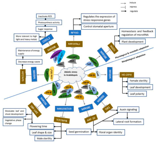 Interestingly, some miRNAs are generally responsive to various abiotic stresses. In Arabidopsis, the expression of miR398 was inhibited by oxidative stress, salt, ABA, and high Cu2+, while miR169a and miR169c were inhibited by drought and ABA stress [95] (Figure 7). In comparison, the expression of miR393 was induced in Arabidopsis by salt, drought, cold, ABA, and UV-B stresses (Figure 7). Also, some miRNAs respond to certain abiotic stresses differently. In Arabidopsis, miR169 was induced by salt, cold, and UVB irradiation but suppressed by drought, heat, and ABA treatment [95].