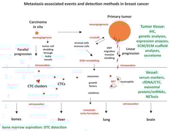 Tumor cells may intravasate and disseminate early on, immediately after neoangiogenesis, as predicted by the parallel progression model, or as a consequence of a sequential, multi-step process (linear progression model). The crosstalk between the tumor cells and stromal and immune cells remodels extracellular matrix and creates populations of cancer-associated stromal and immune cells, facilitating intravasation. Primary site cells extrude signaling molecules and exosomes, which have a potential to prime other tissues for the subsequent dissemination, creating a pre-metastatic niche. Available and developed detection methods (marked in green) contribute to an assessment of the probability of metastasis.