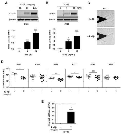 Effect of interleukin-1β (IL-1β) stimulation on the stiffness of primary human pulmonary fibroblasts. (A,B) Representative western blot of COX-2 and β-actin of fibroblasts stimulated with IL-1β at different time points A (top) and doses B (top); (bottom panels) corresponding densitometric analysis. (C) Representative phase contrast image of an atomic force microscopy (AFM) force sensor (cantilever) on top of a single fibroblast stimulated with or without IL-1β for three days. The tip located at the end of the cantilever was used to indent the perinuclear region of each cell locally while monitoring the corresponding opposing force to compute Young´s modulus (E). (D) Total E values obtained on single fibroblasts from our donor cohort (identified by the symbol #150–200) upon IL-1β stimulation as in (B). (E) Fold average E of single fibroblasts measured from each donor shown in C. Horizontal dashed line corresponds to no change (fold ratio = 1). * p < 0.05, ** p < 0.01, *** p < 0.005 were determined by Student’s t-test (here and thereafter) comparing either different time-points with respect to 0 h (A) or presence and absence of IL-1 β stimulation (B,D,E).