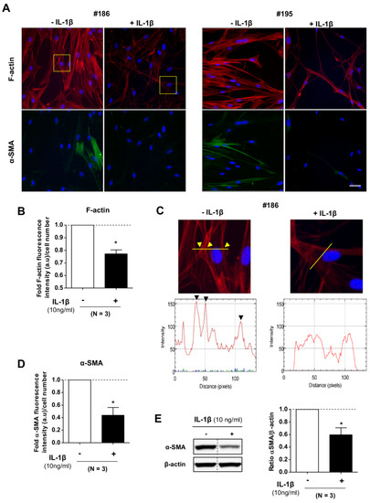 Immunofluorescence analysis of the actomyosin cytoskeleton of primary pulmonary fibroblasts upon stimulation with 10 ng/mL IL-1β. (A) Representative immunofluorescence images of filamentous actin (F-actin) (red), alpha-smooth muscle (α-SMA) (green), and DAPI (blue) with or without IL-1β in fibroblasts from two randomly selected donors (#186, #195). Scale bar, 50 μm. (B) Fold average F-actin intensity/image normalized by the corresponding cell number in fibroblasts from our cohort (n = 3). (C) Zoom of the F-actin staining area labeled by a yellow square in A (top); (bottom) quantification of the F-actin fluorescence intensity across the yellow line drawn in the top images to illustrate the loss of stress fibers (seen as intensity peaks) upon stimulation with IL-1β. Arrowheads point at stress fibers and their corresponding fluorescence intensity peak. (D) Fold average α-SMA intensity/image normalized by the corresponding cell number in fibroblasts from our cohort (n = 3). (E) Representative western blot of α-SMA and β-actin at 24 h with or without IL-1β (10 ng/mL) in fibroblasts from a randomly selected donor (left); (right) corresponding densitometry analysis from fibroblasts from our cohort (n = 3). Statistical analysis as in Figure 1, * p <0.05.