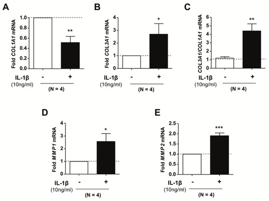 The collagen family of ECM components are abundantly expressed in the lungs and other organs and tissues and are known to play a major role in tissue mechanics [39]. Fibrillar collagens, including type I and type III collagen—whose transcription is partly encoded by COL1A1 and COL3A1 genes, respectively—are particularly relevant in regulating tissue mechanical strength and are highly abundant in the pulmonary interstitium [12]. To assess the impact of IL-1β on the expression of fibrillar collagens, we stimulated pulmonary fibroblasts randomly selected from our donor cohort (n = 4) with IL-1β for three days and examined the expression of COL1A1 and COL3A1 by qRT-PCR. We observed that IL-1β induced a significant reduction in COL1A1 (Figure 3A) concomitantly with a significant increase in COL3A1 (Figure 3B) mRNA (Supplementary Figure S1), thereby eliciting a marked increase in the COL3A1/COL1A1 ratio (Figure 3C), which has been previously associated with scar-less repair [40]. In addition, since the turnover of fibrillar collagens is controlled not only by the expression of COL1A1 and COL3A1 but also by that of their degrading collagenolytic enzymes, we examined the impact of IL-1β on matrix metalloproteinases 1 and 2 (MMP1 and MMP2), which are two major secreted collagenases [41]. Our results revealed that IL-1β significantly increased both MMP1 and MMP2 mRNA in pulmonary fibroblasts compared to untreated cells (Figure 3D,E). These results support that IL-1β favors a reduction of type I collagen in human pulmonary fibroblasts by downregulating COL1A1 mRNA while increasing mRNA levels of major collagenolytic enzymes.