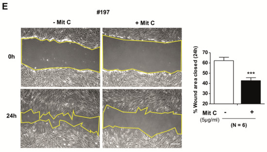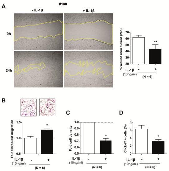 Fibroblasts were seeded in 6-well plates and grown until confluence. A scratch was made on the cell monolayer using a pipette tip, and wound closure was monitored by acquiring bright-field images at 0 h and 24 h with or without 10 ng/mL IL-1β in 1% FBS-DMEM medium. In some experiments, the proliferation inhibitor Mitomycin C (5µg/mL) (Sigma) was added after wounding. The percentage of the closed area was evaluated by ImageJ (v.1.51j8).