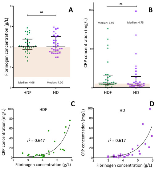 As fibrinogen is an acute phase protein and ESRD patients frequently suffer from inflammatory conditions, the concentration of CRP, an excellent marker of inflammatory reactions, was also measured (Figure 1B) and its correlation with fibrinogen concentration (Figure 1C,D) was evaluated. In 56.6% of the patients on HDF treatment, the CRP level was above the upper limit of reference interval (females: 4.6 mg/L, males: 5.2 mg/L). The median CRP plasma concentration of ESRD patients was 5.95 mg/L, with interquartile range (IQR): 4.02–15.15 mg/L and there were a few outliers. The CRP level of four HDF treated patients was above 50 mg/L, due to acute inflammatory conditions. Their results are depicted by asterisks not only in Figure 1B, but also in figures demonstrating the results obtained for other investigated parameters. In spite of the few individual changes during the two-week period of HD treatment, the CRP levels, in general, did not change significantly. In 53.0% of the patients it remained above the upper limit of reference interval (median: 4.75 mg/L, IQR: 2.52–14.33 mg/L). As shown in Figure 1C,D fibrinogen concentration was an exponential function of CRP level. The high coefficients of determination (r2: 0.647 and 0.671 in case of HDF and HD treated patients, respectively) demonstrate significant correlation (p < 0.001) between the inflammatory condition and fibrinogen levels. Neither the length of HDF treatment period (r2: 0.018, p = 0.590) or the age of patients (r2: 0.035, p = 0.267) correlated significantly with the fibrinogen levels (not shown in Figure 1). There was no significant difference between females and males in the pre-dialysis fibrinogen and CRP concentrations.