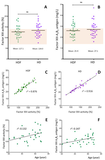 FXIII levels in the plasma of ESRD patients. Plasma FXIII activity (A) and antigen concentration (B) of patients being on chronic HDF treatment or after two weeks of HD treatment. (C) and (D) correlation of the results obtained by activity measurement and immuno-assay; (E,F) correlation of FXIII levels with the age of ESRD patients. HDF: hemodiafiltration, HD hemodialysis, ns: not significant, r2: coefficients of determination. The asterisks on (A,B) represent the four patients with the highest CRP levels.