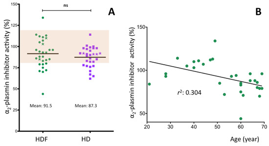 α2-plasmin inhibitor activity in ESRD patients. (A) patients being on chronic HDF treatment or after switching to HD treatment for two weeks. (B) correlation of α2-plasmin inhibitor activity with patients’ age. The coefficient of determination (r2) is also shown in the figure. The asterisks on Figure A represent the four patients with the highest CRP levels.
