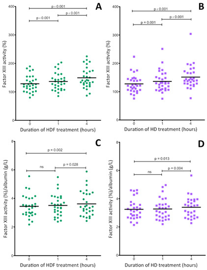 Changes of plasma FXIII activity in ESRD patients during a 4-h HDF (A,C) or HD (B,D) treatment. The upper two figures show FXIII activities not corrected for albumin (A,B), while FXIII activities corrected for albumin concentration are shown in the two lower figures (C,D). Horizontal lines represent mean FXIII activities. Significant differences between results obtained before and after treatments are indicated by the p values above thin horizontal lines.