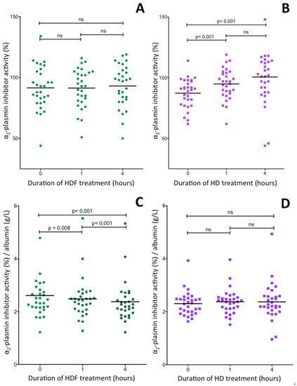 2.6. Changes of Plasma α2-Plasmin Inhibitor Activity during Hemodiafiltration and Hemodialysis Treatments of ESRD Patients