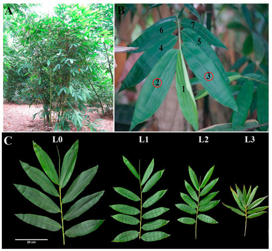 We collected leaves from four stages, including leaves of vegetative clumps (L0) and leaves from flowering clumps (L1, L2, L3) (Figure 1). Leaves from flowering clumps can be divided into three periods: leaves from non-flowering clumps (L1) and big and small leaves from flowering clumps (L2, L3).