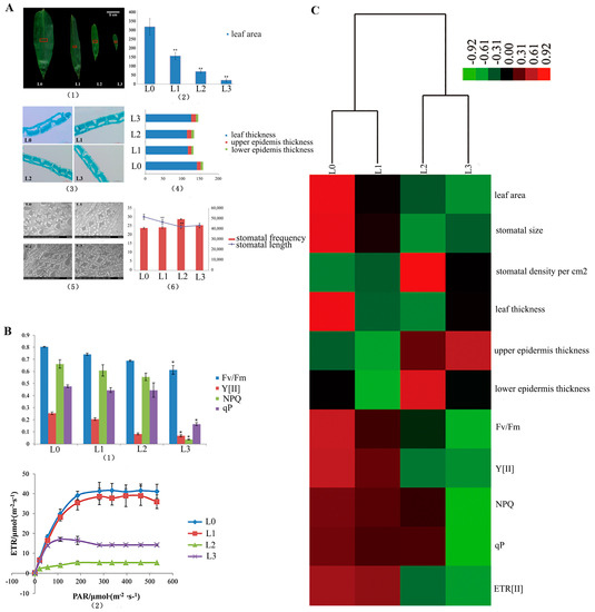 The statistics of the leaf surface, stomata and chlorophyll fluorescence. (A) (1) The middles of the leaf blades were examined by their anatomy (indicated by the red square); (2) leaf area from L0 to L3; (3) SEM of L0, L1, L2 and L3; (4) stomatal frequency and stomatal length from L0 to L3; (5) the leaf anatomy (6) the blade thickness, epicuticle thickness, and lower epidermis thickness. (B) The parameters of chlorophyll fluorescence of the flowering leaves of D. latiflorus. (1) the parameters of chlorophyll fluorescence from L0 to L3; (2) The curves of electron transfer reactions (ETR) from L0 to L3. (C) The heat map of the measurement parameters from L0 to L3. ** p < 0.01, significant difference; * p < 0.05, difference by t-test.