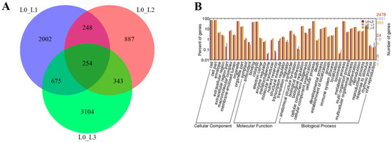 Numbers of shared and unique genes in L0 vs. L1, L0 vs. L2 and L0 vs. L3 (A) and the gene ontology classification of L0 vs. L1, L0 vs. L2 and L0 vs. L3 (B).