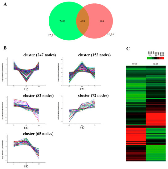 The differently expressed genes from L1 to L3 in the same bamboo clump. (A) A Venn diagram showing the number of differentially expressed genes between every two samples and the number of joint differentially expressed genes. (B) The clustering of differentially expressed genes. Expression ratios are expressed as Log2. The 8 major clusters obtained by the K-means algorithm, representing (1) those down-regulated at L2 and up-regulated at L3; (2) those up-regulated at L2 and down-regulated at L3; (3) those down-regulated from L1 to L3; (4) up-regulated from L1 to L3; and (5) those up-regulated at L2 and down-regulated at L3; the expression level at L3 is lower than that at L1. (C) Hierarchical clustering of the differentially expressed genes.