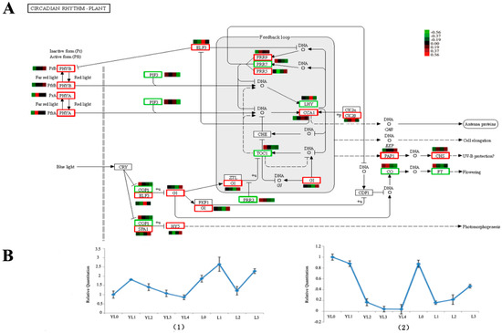 The photoperiod pathways depended on the circadian rhythm for the unigenes according to KEGG annotation (A) and the actual expression levels CO/FT (B) in different stages of the bamboo. (1) The CO gene expression level; (2) the FT gene expression level. The red square in (A) indicates up-regulation in L3 relative to that in L0, the green square indicates down-regulation in L3 relative to that in L3, and the bar in (B) denotes the standard error. YL0 shows 3 months of bamboo seedlings, YL1 shows one year of bamboo seedlings, YL2 shows two years of bamboo seedings, YL3 shows five years of bamboo seedlings, YL4 shows six years of bamboo seedlings. L0, L1, L2 and L3 have the same meaning in this paper.