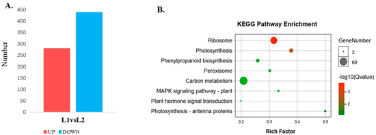 A total of 4636 proteins were identified and protein annotation was performed by BLAST against Nr, Uniprot, KEGG and COG. Of these 4629 annotated proteins, 4282 protein sequences were classified into 24 COG categories (Figure S7, Table S7). A 95% confidence level (p < 0.05) and a 1.2-fold change were used to identify proteins that were differentially expressed between L1 and L2 during floral transition. Using these criteria, 721 differentially expressed proteins (282 up-regulated and 439 down-regulated) were found (Figure 6A, Tables S8 and S9). The 721 differentially expressed proteins were searched against the KEGG pathway with 397 proteins significantly enriched (p < 0.05) in 8 metabolic pathways (Figure 6B). Notably, 44 differential proteins were predicted to be involved in photosynthesis-related pathways (photosynthesis: 29; 5.1%; photosynthesis-antenna proteins: 15; 2.64%) during floral transition. Many proteins were mainly focused on the “ribosome”, “phenylalanine metabolism”, “peroxisome”, etc.