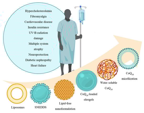 In the present review, the most recent CoQ10 applications of therapeutic and scientific interest will be examined (Figure 1 and Table 1), as well as the state-of-the-art CoQ10 formulations (Figure 2). To conclude, future perspectives associated with the use of this versatile molecule will be discussed to give a general overview of the promising advances that the field can undergo.