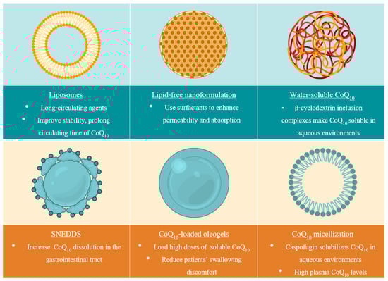 CoQ10’s low gastrointestinal absorption and low oral bioavailability are a consequence of its low intestinal permeability and high molecular weight. Self-nanoemulsifying CoQ10 delivery systems have been developed to face the challenge of this drug’s oral administration by increasing its dissolution in the gastrointestinal tract (GIT) []. Self-nanoemulsifying drug delivery systems (SNEDDS) can be defined as an isotropic and thermodynamically stable mixture of an oil, a surfactant, a co-surfactant, and a drug that forms nanoemulsion droplets of a reduced size (<100 nm) when subject to dilution in an aqueous medium under gentle agitation, similar to the gastric movements of the GIT []. The fundamental standard of these SNEDDS is that when the emulsion is formed in the GIT of the patient, the drug is presented in a solubilized form inside nano-sized droplets that provide a larger surface area for enhancing the drug’s release and absorption []. This novel approach to increase CoQ10’s dissolution and absorption has proven successful in recent studies, in which a daily intake of 100 mg of CoQ10 SNEDDS is proposed as a sufficient dietary supplement to compensate for low CoQ10 levels in patients suffering from various diseases [].