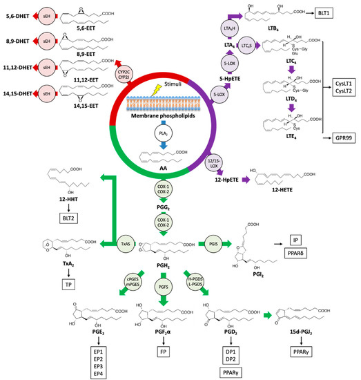 Biosynthetic pathways and receptors of eicosanoids. Upon stimulation, an omega-6 PUFA arachidonic acid (AA) is liberated from the phospholipids of the cell membrane by the action of phospholipase A2 (PLA2), and AA is metabolized into various bioactive lipid mediators. Prostanoids, leukotrienes (LTs), hydroxyeicosatetraenoic acid (HETEs), and epoxyeicosatrienoic acid (EETs) are formed from AA via cyclooxygenase (COX) (green), a lipoxygenase (LOX) (purple), and cytochrome P450 (CYP) (red) pathways, respectively. Specific eicosanoid receptors and peroxisome proliferator-activated receptors (PPARs) that are potentially activated by eicosanoids are shown in boxes. sEH: soluble epoxide hydrolase; TxAS: thromboxane A synthase; PGIS: prostacyclin synthase; PGFS: prostaglandin F synthase; cPGES: cytosolic prostaglandin E synthase; mPGES: membrane-associated prostaglandin E synthase; H-PGDS: hematopoietic-type prostaglandin D synthase; L-PGDS: lipocalin-type prostaglandin D synthase; LTA4H: LTA4 hydrolase; LTC4S: LTC4 synthase; HpETE: hydroperoxyeicosatetraenoic acid.