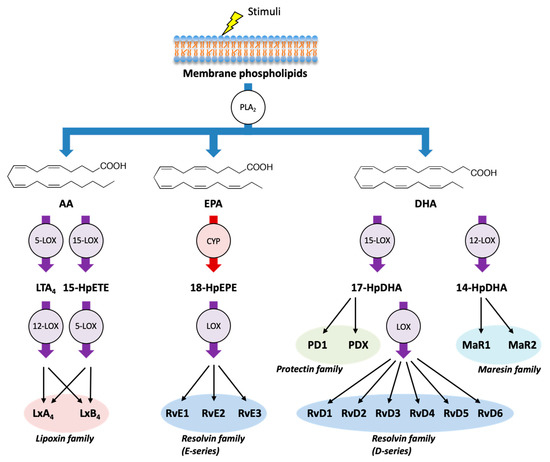 In addition to AA, LOXs and CYPs can metabolize the omega-3 PUFA EPA and DHA and can produce several classes of SPMs (Figure 2). E-series of resolvins (RvE1, RvE2, and RvE3) are formed from EPA through the combination of LOX and CYP enzymes, whereas D-series of resolvins (RvD1, RvD2, RvD3, RvD4, RvD5, and RvD6) are formed from DHA through the combination of LOX enzymes. Moreover, DHA can be metabolized into another class of SPMs such as protectins (PD1 and PDX) and maresins (MaR1 and MaR2) [28,46].