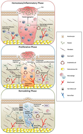 On the other hand, wound healing might be promoted by the inhibition of eicosanoids production such as LTs that have a negative effect on the processes [110,111,112]. An aspect that must be noted is that because eicosanoids and SPMs have a common precursor, modifying one pathway will affect the other. Therefore, a much more comprehensive study such as a time-course study of lipidomics during skin wound healing is required to better understand the complex interaction of lipid mediators.