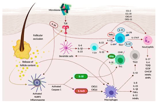 IL-1β is produced mainly by monocytes and macrophages and contributes to amplify the inflammatory pathway leading to the induction of chemokines such as CXCL1 and CXCL6 involved in neutrophilic granulocytes’ recruitment []. Furthermore, IL-1β enhances the secretion of MMPs, which supports immune cell infiltration and contributes to tissue damage. Overexpression of IL-1β at mRNA and protein levels has been reported in lesional, perilesional, and normal-appearing HS skin compared to that in healthy control [], and an active IL-1β pathway was also found in the serum of patients []. As result, IL-1β signaling induces overexpression of inflammatory markers, mainly IL-8, TNF-α, and IL-17 stimulating chemotaxis of new neutrophils into the damaged skin, pus formation, and triggering of the inflammatory loop [].