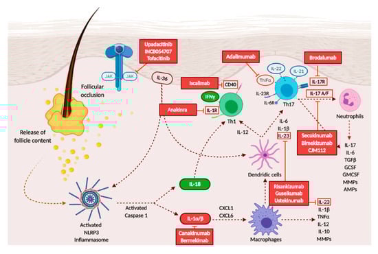 Adalimumab, a monoclonal antibody directed against tumor necrosis factor-α, already approved for psoriasis and other various rheumatological and gastroenterological diseases [], is the only biologic agent currently available for the treatment of moderate-to-severe HS resistant to antibiotics. However, several cases reported a certain rate of primary or secondary lack of response in some patients []. Numerous other specific anti-interleukins and small-molecules drugs are currently under investigation for the treatment of HS. The main HS-related drugs and their targets are represented in Figure 3.