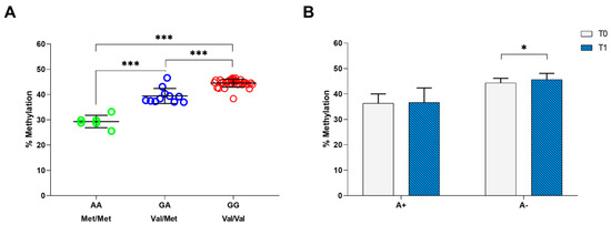 Methylation analysis of BDNF rs6265 polymorphism. (A) Average percentage of methylation in patients with stroke carrying the GG (Val/Val), GA (Val/Met) and AA (Met/Met) alleles. (B) Average percentage of methylation before and after the 30-session rehabilitation intervention for patients carrying A+ and A− alleles. The asterisks indicate a statistically significant difference: *** p < 0.001 and * p < 0.05, according to the paired t-tests.