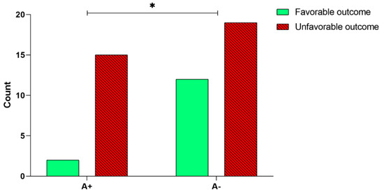 Analysis of BDNF rs6265 polymorphism and the rehabilitation outcome. Number of patients carrying A+ and A− alleles that obtained a favorable outcome after the 30-session rehabilitation intervention. The asterisk indicates a statistically significant difference: * p < 0.05, according to the χ2 test.