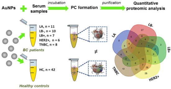Particularly, AuNPs present some properties to be used as suitable sorbent nanomaterials: high surface-area-to-volume ratio, colloidal stability and the ability to conjugate with biomolecules [17]. Here, the interaction of AuNPs (12.96 ± 0.72 nm) with the sera of disease-free women (healthy controls, HC) (n = 42) and BC patients (n = 42) allowed the pre-concentration of the low-abundance proteins thorough the PC formation. Then, an exhaustive quantitative analysis of the PCs by SWATH-MS was carried out to identify novel molecular targets associated to the different BC intrinsic subtypes (see Figure 1).