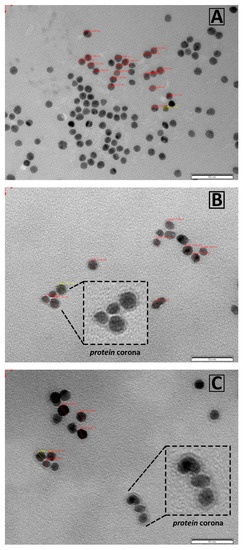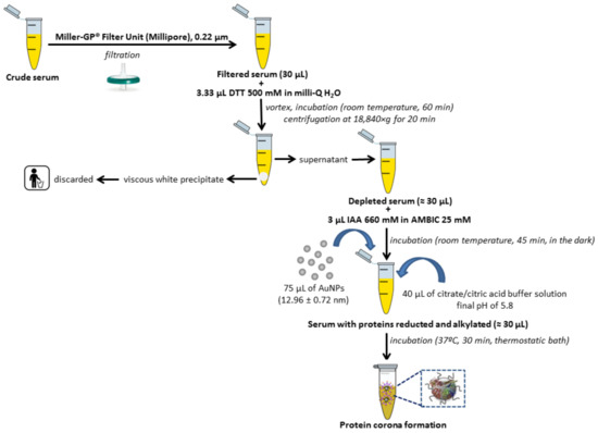 AuNPs with a size of 12.96 ± 0.72 nm were prepared by a chemical reduction method [12,13,14]. As Figure 2 shows, proteins presented in serum samples (×2) were chemically reduced with dithiothreitol (DTT) and alkylated with iodoacetamide (IAA) before their ex vivo incubation with AuNPs (12.96 ± 0.72 nm) to get the formation of the PCs [12,13,14].