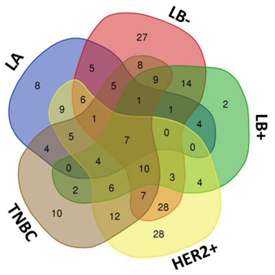 Venn diagram showing the number of shared and specific (or unique) deregulated proteins identified in the PCs formed after the interaction of AuNPs (12.96 ± 0.72 nm) with serum samples of the different BC subtypes (LA, LB-, LB+, HER2+ and TNBC).
